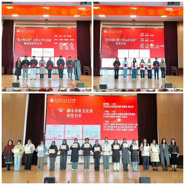 闭幕式在青春昂扬的歌声中拉开帷幕。随后进行的颁奖环节,依次揭晓了“东方财富杯”全国大学生金融挑战赛、“智慧银行数字化运营竞赛”以及“绿融未来”主题征文比赛的获奖名单。这些赛事不仅锤炼了学生的实战能力,更展现了学院在数字化金融、绿色金融等前沿领域的育人布局。