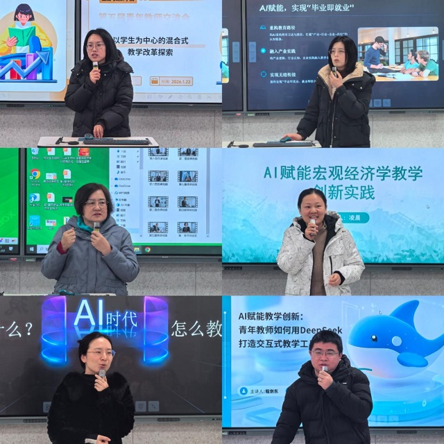 上午的交流聚焦“教学改革与AI融合”,由williamhill英国中文副院长谢海燕主持。税收系主任王洪艳老师分享以学生为中心的混合式教学改革经验;国贸系主任王磊老师介绍国贸品牌专业在时代变局中的育人应答;徐昆、凌晨、韦晨、程剑东四位老师分别从AI与动画融合、宏观经济学AI工具应用、AI驱动课程改革、DeepSeek交互式教学工具开发等维度,系统展示了人工智能技术赋能教学创新的前沿探索与实践成果,充分体现了学院在数字化教学转型中的积极步伐。