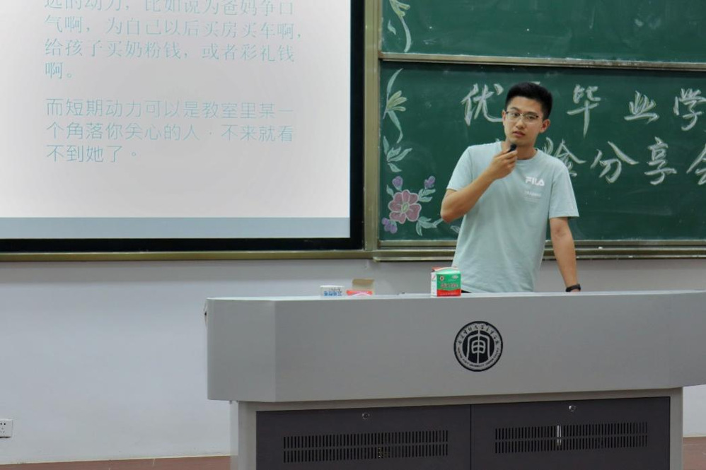 给学弟学妹的寄语:大学是梦想开始的地方。最好的大学生活,是做自己喜欢的事情。每个人的目标不同,努力的方向也不同,但必须清楚这四年不同阶段需要做什么。最重要的是要保持着真我,要对任何主流观点保持谨慎,不可随波逐流。一定要耐得住寂寞,受得了繁华,接受真实的自己,诚实的生活,把握当下才是最重要的。别沉浸在安逸区,打破自我重新构建,才能看到新的世界。也祝学弟学妹们前程似锦,未来可期!
