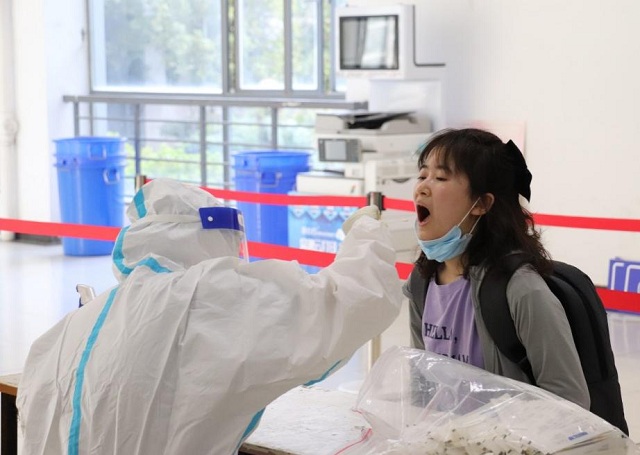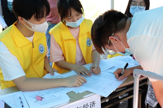 教学楼B东大厅,是学校的核酸检测点。为确保每一位学生的安全,学校严格把关,排除隐患,为新生们打造安全感满满的迎新环境。