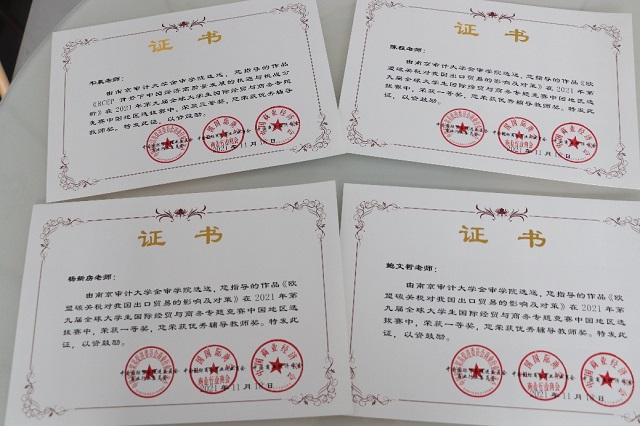 本次比赛由中国国际贸易促进委员会行业委员会和中国国际商业行业商会联合主办,是国际贸易学科规格较高的一项赛事。此次比赛共有来自全国40所高校的150支队伍参加。我校派出的三支队均获得较好名次,其中由陈程、鲍文哲、杨新房三位老师指导,叶婷、马思遥、范澄宇、施沛淇、褚斯钰、张凯歌六位参赛选手完成的作品“欧盟碳关税对我国出口贸易的影响及对策”,与由孙忠悦、韦晨两位老师指导,李许怡、徐倩、朱嘉禧、黄千禧、刘天意五位参赛选手完成的作品“论国际营销的思维转变——逆向营销”两个作品荣获一等奖;由韦晨、孙忠悦两位老师指导,犹沅、刘畅、王怡雯、孙娴、庄泳飞五位选手完成的作品“RCEP 背景下中国经济高质量发展的机遇与挑战分析”荣获三等奖。同时,WilliamHILL中国荣获“最佳院校组织奖”,陈程、鲍文哲、韦晨、孙忠悦、杨新房五位老师获得“最佳指导教师奖”。