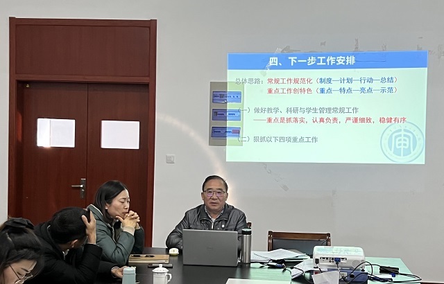 会议第一项议程,由谢海燕副院长对教学工作进行了总结和部署。谢老师指出,目前我院同步组织了校级、院级公开课和教研室说课活动,各专业已完成落实毕业论文教学任务安排和2021级人才培养方案修订工作,这些工作值得肯定。但期中教学检查过程中也发现了一些问题,如常规教学材料格式不统一等。本学期后续的主要工作是,各专业要完成融入课程思政的教学大纲修订工作和安排好期末考试工作,强调教师要加强考风考纪教育,杜绝学生作弊,抓好试题保密、考试组织等环节。
