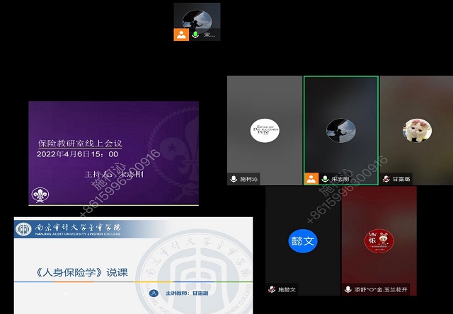 经过一年多的积累,各一流课程的建设已有了初步成果。基于全校公开课的契机,教研室主任宋志刚老师组织全体教师开展《人身保险学》课程的线上教研活动。甘露璐老师首先做了《人身保险学》的说课,从课程设置、课程内容、课程资源、教学方法与微观教学展示及课程建设思考五方面对该课程进行了介绍。