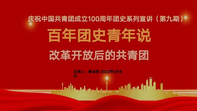一百年来,中国共青团始终与党同心,跟党奋斗,带领广大团员把忠诚写在党和人民的事业中,把青春播撒在民族复兴的征程上,把光荣镌刻在历史行进的史册里。6月8日下午,由我院崔业昀同学开展的百年团史青年说系列活动第九期——“改革开放后的共青团”获得圆满结束。