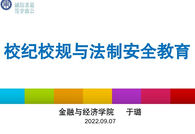 9月7日上午,于璐书记向新生作校纪校规和法制法规教育讲座。于书记带领同学们了解了校园行为规范、公寓管理规定、请假制度等校纪校规,并告知同学们务必严格遵守大学的校纪校规。在法制法规教育方面,于书记列举了一些常见大学生的违法犯罪行为、大学生犯罪的原因等。于书记的讲话为新生们树立起一道校纪校规与法制法规的警戒线。