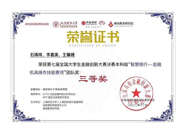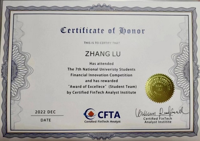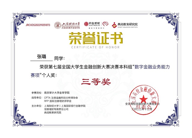 张璐同学荣获第七届全国大学生金融创新大赛决赛本科组“数字金融业务能力赛项”个人三等奖,并获得CFTA注册金融科技分析师协会颁发的优秀奖证书。