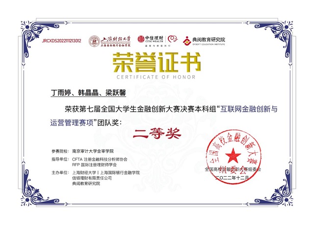 丁雨婷、韩晶晶、梁跃馨团队,荣获第七届全国大学生金融创新大赛决赛本科组“互联网金融创新与运营管理赛项”团队二等奖。