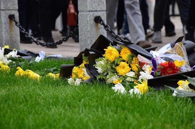 雄碑耸立,是先烈高大的身影;溪水长流,是英雄不朽的灵魂。雨花台烈士纪念碑碑座前竖立着一尊主题为“挣开镣铐”的青铜雕塑,象征着共产党人、爱国志士宁死不屈的革命精神。全体成员在肃穆的烈士纪念碑前敬献鲜花、肃立默哀三分钟并深深鞠躬,表达对烈士的崇高敬意和深切悼念之情。