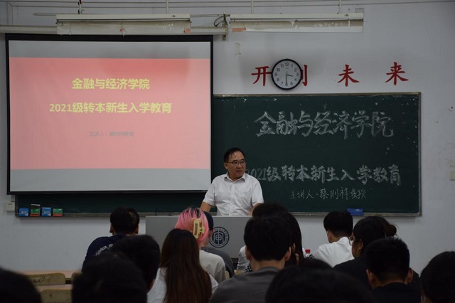 会议开始,蔡则祥教授对2021级专转本新生的到来表示祝贺和欢迎。蔡院长围绕三个问题与大家进行亲切互动:一、自己的优势所在;二、自身目前的短处;三、接下来应该做什么。蔡院长表示新阶段、新平台,要树立新目标,并对自身有新认识。从专到本,说明同学们有明确上进的目标和不服输的心态,并鼓励同学们不能妄自菲薄、安于现状,仍要充满干劲,努力向上;对于短处,蔡老师解释道,转本学生的起点较低,本科院校对于专科而言,培养目标和要求都有所不同,本科注重科研素养和科研创新,涉猎的知识面更广,知识层次更深,需要大家积极主动,开阔眼界;就如何做的问题,蔡院长提到三个关键词:扬长避短、奋发向上、争先达标,需要同学们继续深入学业当中,埋头苦干,去完成本科的“标”。