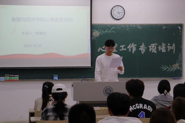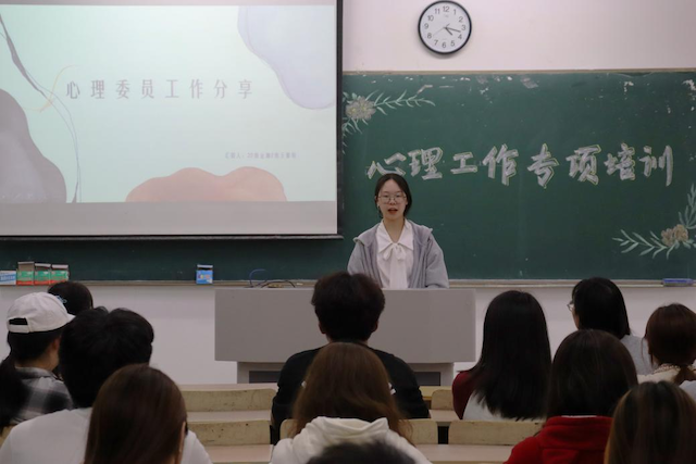杨菊杰老师指出拒绝躺平,工作要用心,心中要有一杆秤,在其位谋其政。心理委员是沟通学生和老师间的桥梁和纽带,不仅是助人者也是宣传者。2021级税收1班周训煜同学和2022级金融2班王馨怡同学提醒心理委员应与同学们经常接触,严守他人秘密,坚守初心,拥有一定的心理知识储备,在他人难过时雪中送炭、给予安慰,不是最后一根稻草而是救助别人的最后一滴水。
