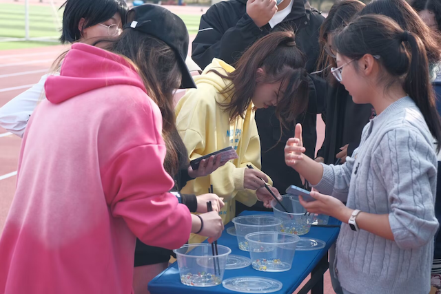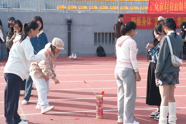 操场上,同学们屏气凝神,瞄准剑壶,其他同学目不转睛地盯着“箭羽”的飞行轨迹,为投中欢呼,为失误加油。整个比赛现场热闹非凡,大家热情高涨,无不享受着繁忙学业外的轻松愉悦。