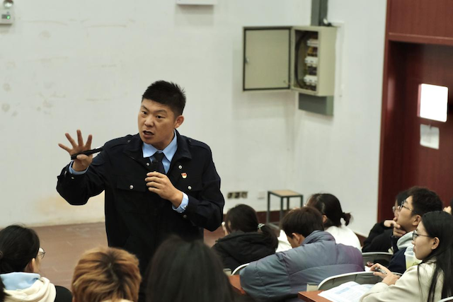 灾难无情,英雄无畏。眼前的岁月静好,是无数消防战士的冲锋陷阵。蔡教官表示“正确地应对火灾发生,亦是在帮助消防员的救援工作”。紧接着,他从“如何正确报警、如何扑救初期火情、如何自救逃生”等基本知识进行详细讲解。师生们积极学习,受益匪浅。