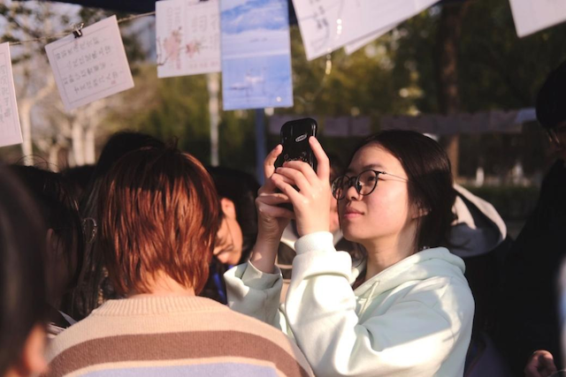 午间的阳光洒在广场上,一盆盆绿植排放整齐,同学们已经将现场团团围住,她们手里拿着明信片,在上面写下自己对未来的期许和心愿,将明信片高高挂起,飘扬在春日的暖阳里这一刻,她们的梦想也随春风一起,扬帆起航。这张纸片也将成为连接过去与未来,心愿与现实的重要纽带。有人期望未来能实现财富自由,有人写下“因为有梦,所以勇敢出发。”每句话都带着她们对自己的期待与展望,传递着她们的生机与活力。在写完明信片之后,大家在团学干事处领取了一个属于自己的绿植,希望她们的梦想会和这株植物一样,生机勃勃,茁壮成长。