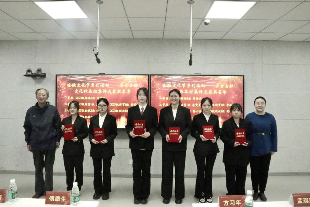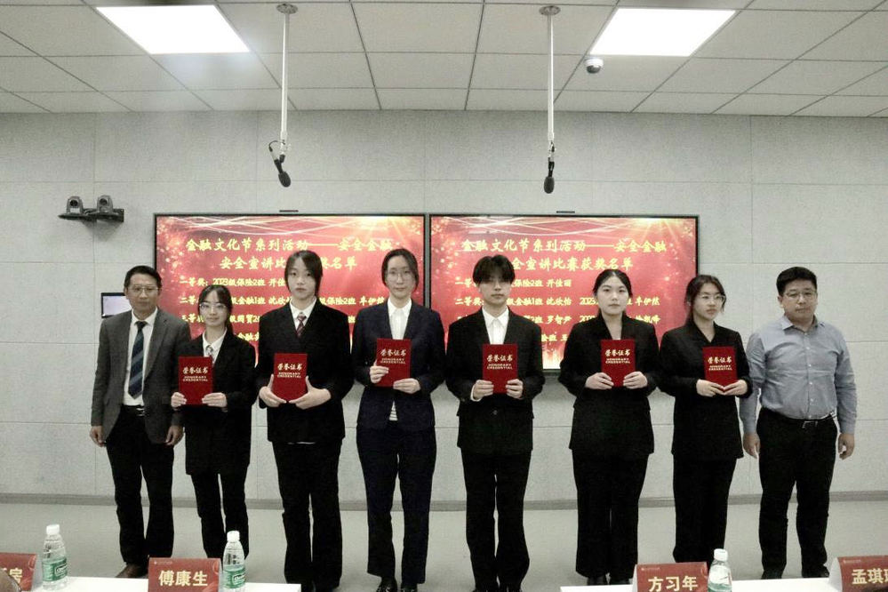 最后,由教务处处长杨新房、校团委书记朱振飞、副校长傅康生、校长助理孟琪璐分别为金融安全知识宣讲比赛和安全金融文化作品评选比赛获奖学生颁奖。
