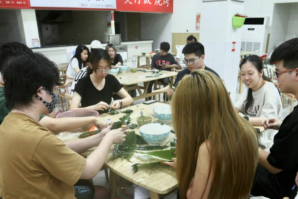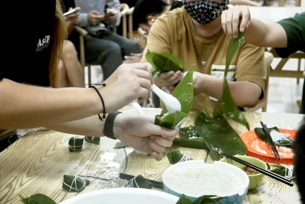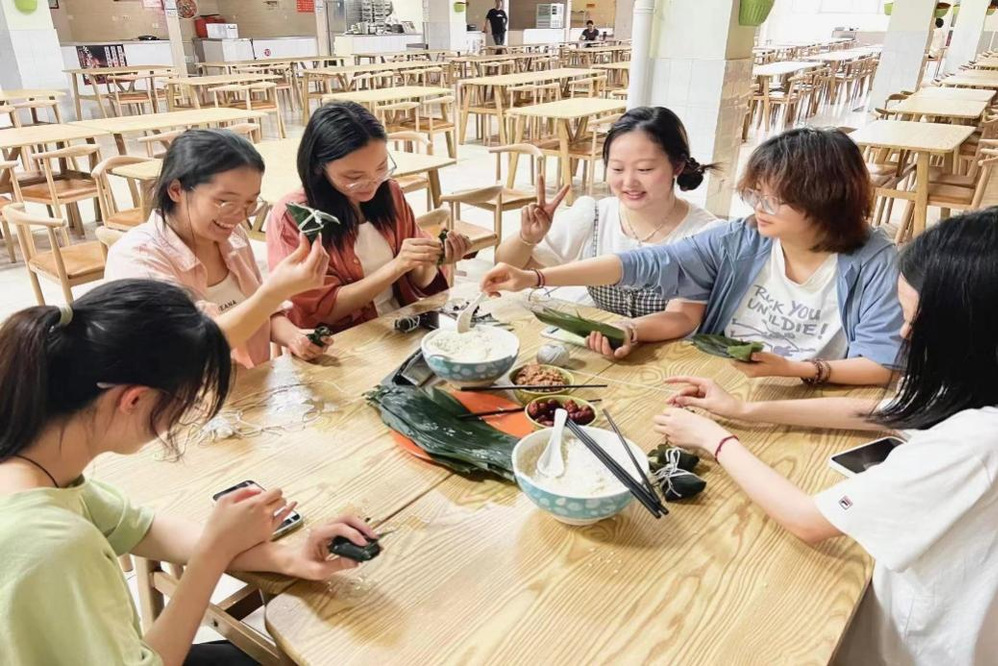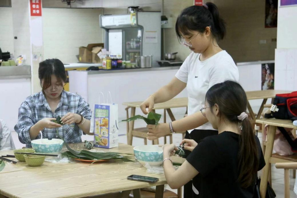 翠绿的粽叶在同学们手中翻飞,糯米、红枣等馅料被细心地包裹在粽叶中,形成一个个大小各异的粽子。同学交流着包粽子的心得和技巧,现场气氛热烈,欢声笑语不断。粽子煮熟后,同学们将自己亲手制作的粽子与大家一起分享,糯米的细腻、红枣的甘醇……粽叶传情迎端午,各种馅料在同学们的巧手下巧妙地融为一体,在欢乐中提前感受到了端午的氛围。