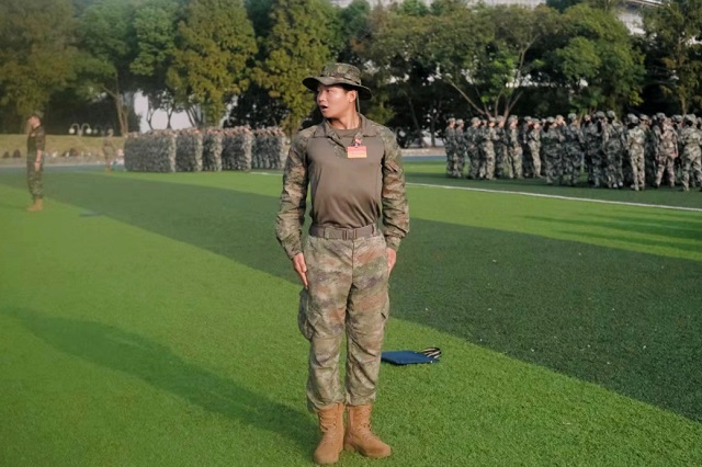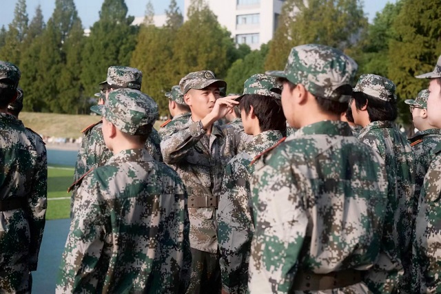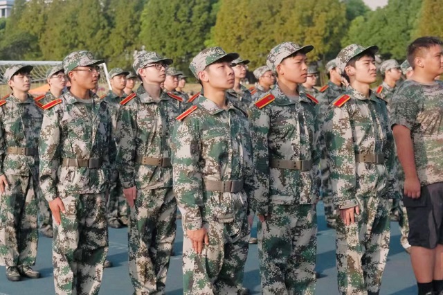 军训伊始,由教官们带领各连学子学习最基本的站军姿。双脚分开约60厘米,脚跟并拢,双手紧贴裤缝,两肩后张收腹,下颌微收,身体微倾,抬头挺胸目视前方。军姿是军人风采的展现,也是纪律与坚韧的象征。在教官的耐心指导下,每一位学生都站得笔直,目光坚定,阳光透过树叶洒在他们的迷彩服上,成了我院最亮丽的一道风景线。