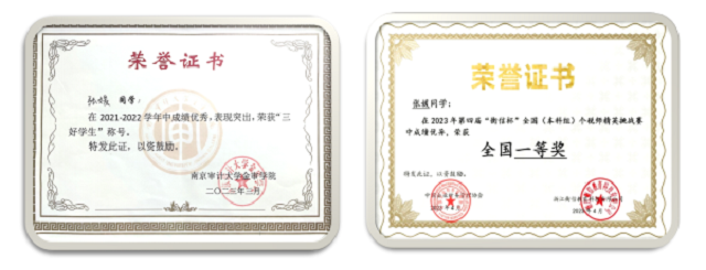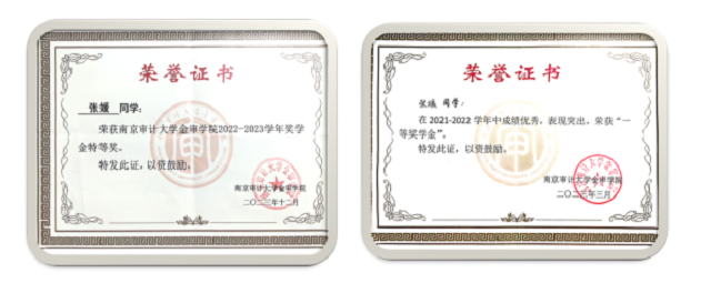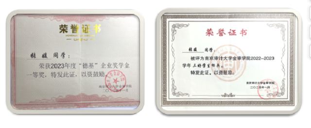她致知穷理,潜心问学。平均绩点3.8823,多达30多门科目成绩90+,综合素质测评100分,连续三年专业成绩和综测排名位列专业第一,获得特等奖学金、一等奖学金、三好学生标兵、三好学生、优秀学生干部等荣誉。2024年经班级提名、学院评议推荐、校评审小组评定,学校拟推荐张媛为2024年度江苏省优秀学生干部。她将学习与实践相结合,参加大学生创新创业计划项目获得省级立项。她课赛融合,不断进取,积极参加2023年“衡信杯”全国个税师精英挑战赛,荣获全国一等奖;参加2023年全国本科院校税收风险管控案例大赛,荣获江苏省三等奖。