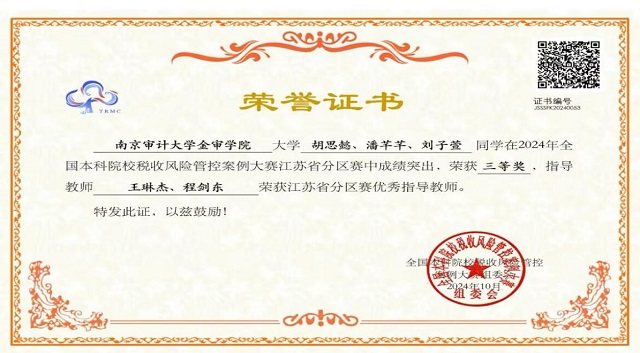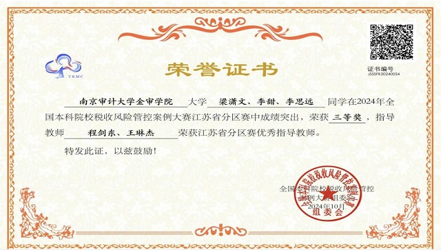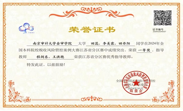 本次大赛为江苏省内分区赛,全省共计159支队伍,williamhill英国中文选派30名税收学专业学生组成10支代表队参赛。分区赛的竞赛内容为自创税收风险管控案例分析,参赛队伍需在规定时间内上传规定案例资料。赛前,为了提升我校参赛选手实战能力,王琳杰老师专门组织了税收风险管控案例大赛说明会及案例撰写培训,通过一系列生动实例,向同学们展示如何精准识别企业税收风险点和有效制定管控策略。会后,同学们通过紧密团队协作,分工搜集一手资料和梳理财税政策,围绕税收风险管控案例风险点展开积极讨论,不断完善案例,展现了高效的协作能力和出色的专业素养。最终在王洪艳、王琳杰与程剑东三位老师的指导下,由田蕊、李美霖、田丹阳三人组成的团队荣获江苏省一等奖,由胡思懿等15名同学组成的四支队伍荣获江苏省三等奖。