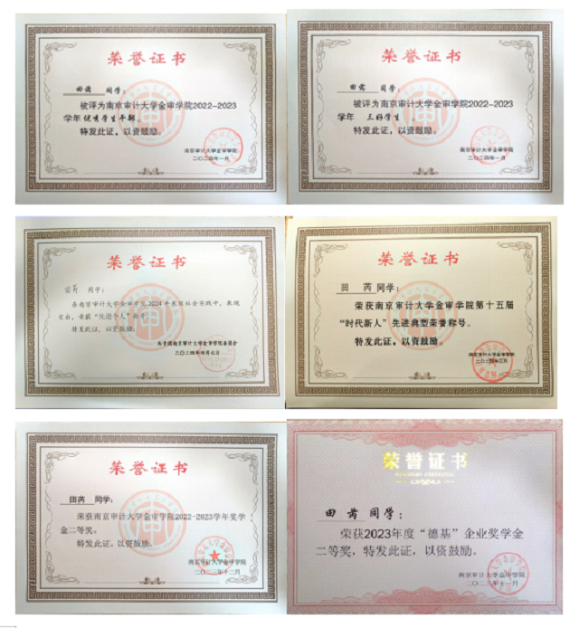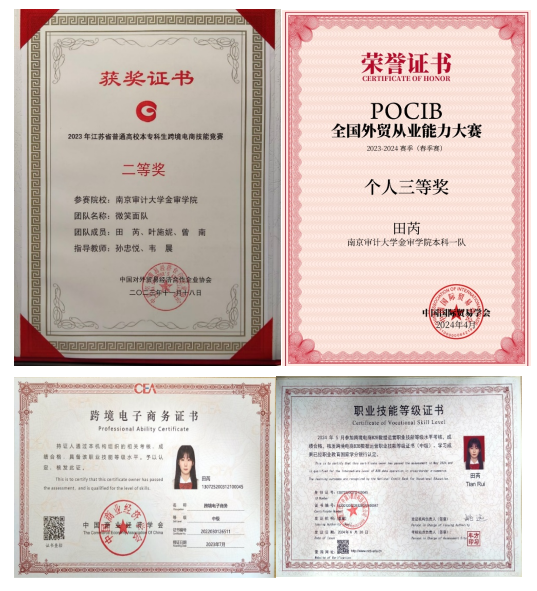 田芮同学深知知识积累的重要性,进入大学以来一直勤勉务实,笃行不怠,一步一个脚印,取得了突出成绩。她专业绩点3.2906,位列班级前茅,综合测评连续三年位于专业前五。现已通过全国大学英语四六级、江苏省计算机二级等考试。为扎实推进专业技能,提升专业素养,她积极参加学校组织的各项国贸专业技能大赛,在2023年江苏省普通高校本专科生跨境电商技能竞赛中荣获二等奖、POCIB全国外贸从业能力2023-2024赛季(春季赛)中荣获本科组团体特等奖、个人三等奖。为提升专业能力,增加竞争力,她还考取跨境电子商务、跨境电商B2B数据运营、初级会计师等资格证书。