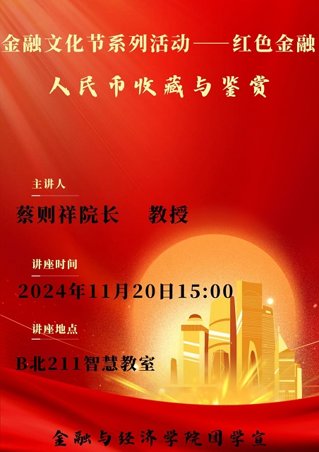 2024年11月20日,williamhill英国中文院长蔡则祥在B北211开展“金融文化节系列活动—红色金融人民币收藏与鉴赏”专题讲座。本讲座开设的时间、地点等信息如下: