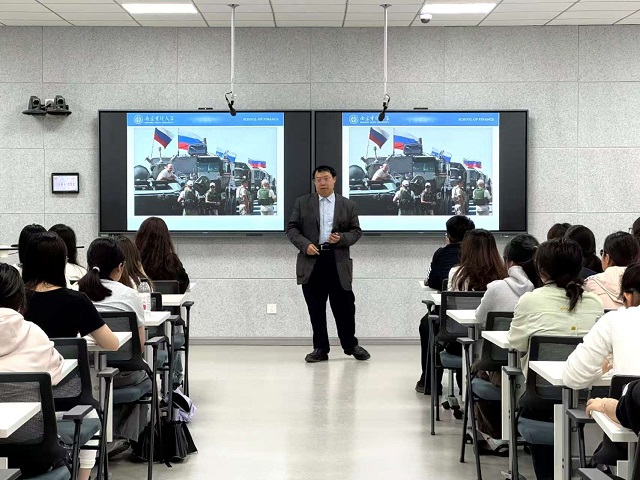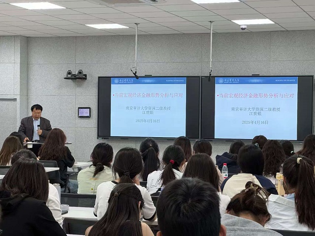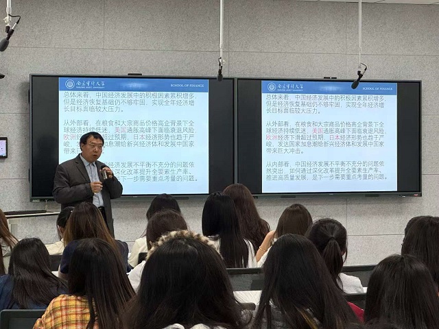 江世银教授聚焦当前国际宏观经济变局为同学们详细分析国际形势,指出当前国际形势的不确定性和市场趋势难以把控性;同时指出我国当前经济的优势与劣势,预测未来发展方向。