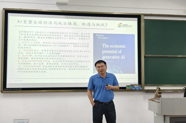 讲座伊始,华教授以麦肯锡关于人工AI重塑全球经济和就业格局的调研结果,引出人工智能话题,拉开讲座序幕。他主要围绕人工智能对贸易成本、贸易效率、贸易模式、贸易对象、贸易治理的影响等角度展开洞见深刻的分析:在贸易成本方面,他提出人工智能降低贸易总体成本、合理成本和翻译成本的优势;在贸易效率方面,他指出AI通过自动化技术和数据分析,显著提升了生产效率;在贸易模式方面,他指出生成式AI对货物贸易和服务贸易的智能推动及对全球产业链的积极影响;在贸易对象方面,他提出人工AI对贸易外包职业的替代和数据标注等新产业的催生;在贸易治理方面,他围绕效率潜力、公平问题和安全问题展开详细的探讨。华教授重点推荐江苏省高校“丝路电商”创新挑战赛,建议同学以此次大赛为切入点,提升自己的创新创业能力。