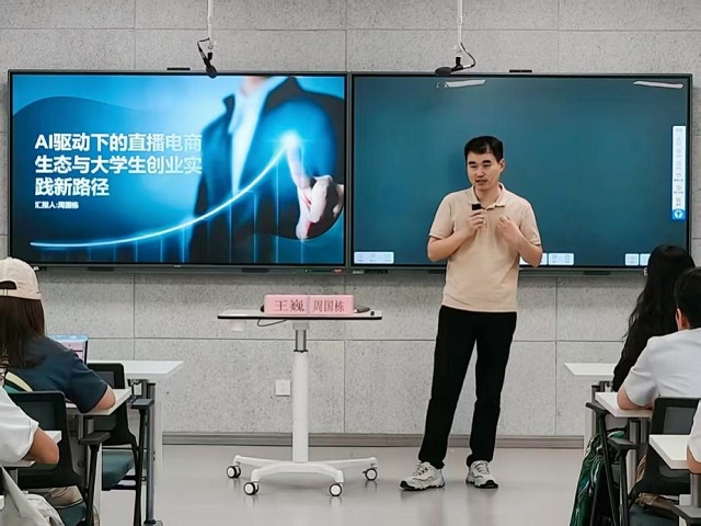 讲座中,周会长凭借丰富的行业经验和专业知识,详细介绍直播电商行业的发展趋势、运营模式创新等内容,深入剖析AI技术如何赋能直播电商生态。他结合大学生创业实际情况,分享直播电商领域创业实践的新路径,包括如何挖掘创业机会、整合资源、应对挑战等,为有创业意向的学生提供了宝贵的思路和借鉴。现场互动环节,同学们积极提问,周会长耐心解答,气氛热烈。