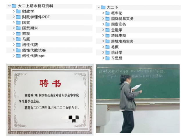 作为班级学习委员和学生教学信息员,徐爔始终以高度的责任感和服务意识投入工作,积极为班级同学的学习和发展贡献力量。她充当老师和同学们之间的“桥梁”,主动与任课老师沟通,及时传达课程安排和学习任务,确保班级同学能够高效完成学业。对于学习成绩薄弱的同学,她整理期末各科重点资料,为其提供帮助,努力提高班级整体水平。此外,她积极推动班级学风建设,组织帮扶学习小组,促进同学之间的互助与合作。她还协同其他班委高效地完成各项工作,提升班级凝聚力。