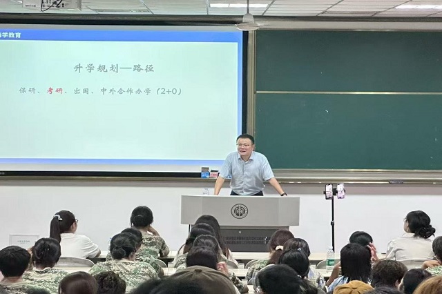 主讲人刘秀全既是江苏省职业大赛专家评委,也是腾讯、新浪考研频道特邀主讲嘉宾,同时也是南京理工大学、南京师范大学、南京医科大学特聘生涯规划导师,他在大学生职业生涯规划方面具备资深的行业指导经验。他首先围绕了“升学规划——路径”,详细剖析保研、考研、出国、中外合作办学几条重要升学路径,他强调保研是机遇与实力的双重考验,不仅要求学生在本科阶段保持优异的学业成绩,还是在科研创新、学术竞赛等方面有所建树;考研是“千军万马过独木桥”,不仅要面对数学、英语、政治等公共科目的挑战,还要深入钻研专业课;出国则是拓宽视野的国外之路,首先要准备语言考试,同时也要求优秀的绩点排名;中外合作办学成本比全程国外留下低,同时能享受到国外合作高校的优质教育资源。