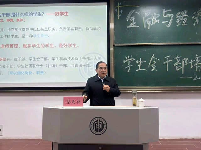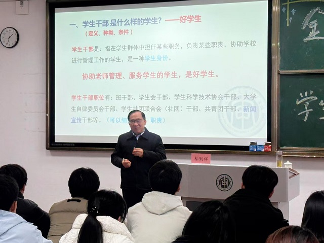 蔡则祥院长以学生干部的素质和能力品质为切入点,对在场的学生干部提出了三个问题:学生干部是什么样的学生、当学生干部有什么意义、怎样成为一名优秀学生干部,并且对此三问做了详细深入的讲解。
