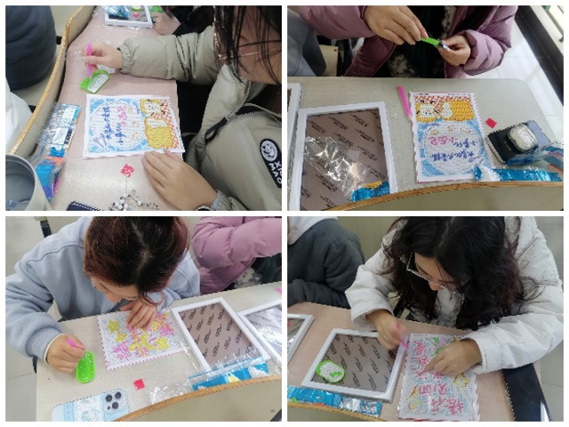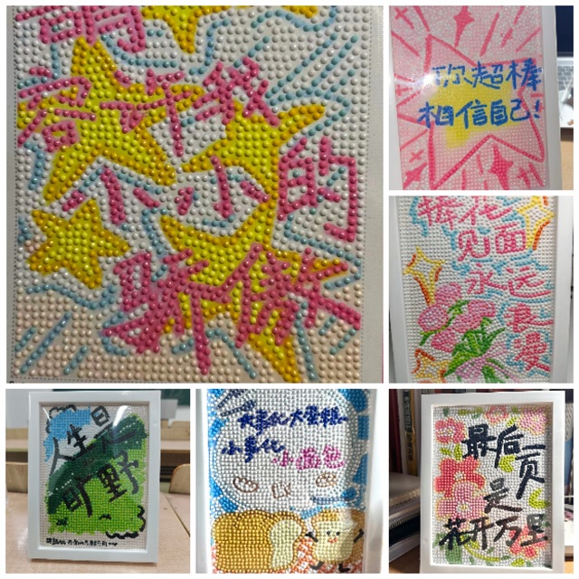 “平时上课赶作业的节奏紧凑,大脑始终处于紧绷状态,今天专注贴钻时,什么都不用多想,整个人特别放松。” 一位同学分享道。另一位同学则坦言:“看着零散的钻石一点点拼成完整图案,这种从无到有的成就感格外治愈,所有烦恼都被抛到了九霄云外。” 当一幅幅亮晶晶的作品装入相框,满满的喜悦与自豪在现场悄然升腾。