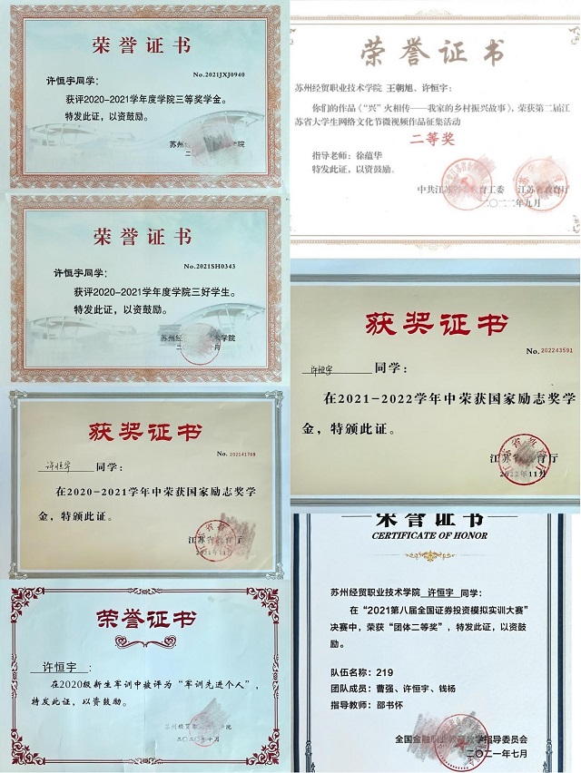 2020年的金秋,许恒宇踏入大学校园,自此便在勤学善思与实干笃行的坐标中锚定成长方向。课堂之上,他专注深耕专业知识,将求知的热忱转化为扎实的学业成果——连续两年斩获国家励志奖学金,获评校三好学生,拿下校三等人民奖学金,用一张张荣誉证书为大学生涯筑牢根基。军训场上,他以严谨作风和昂扬姿态获评军训先进个人,更顺利加入国旗护卫队。严于律己、精益求精的信念,在晨光中的队列训练里悄然扎根,成为日后成长路上的精神底色。学生工作中,他同样绽放光彩。2021至2022年,担任学生会主席的他,统筹校园文化节、学科竞赛等各类活动,协调各部门高效落实任务,耐心收集学生诉求并积极反馈给学校。在一次次统筹协调与沟通服务中,他的组织能力与责任担当不断提升,更深刻领悟到力所能及,便全力以赴的服务真谛,这份初心也贯穿于此后的志愿服务与军旅生涯。专业实践的赛道上,他始终保持探索热忱。2021年,他与团队并肩征战第八届全国证券投资模拟实训大赛,面对全国589所院校、21046支队伍的激烈角逐,他们将课堂所学的金融市场知识、证券业务技能灵活运用到模拟交易中,凭借精准分析与默契配合斩获团体二等奖;同年,他参与第二届江苏省大学生网络文化节微视频作品征集活动,用镜头捕捉青春瞬间,传递青年思考,荣获省级二等奖。这些经历让他深刻意识到,专业学习既要懂理论,更要会应用,也为日后与金融学专业的结缘埋下伏笔。