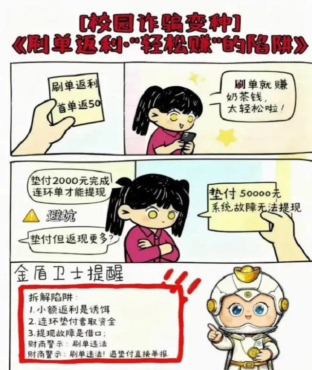 骗子以“简单操作、快速返利”为噱头,首单小额刷单后立马返本+返利,等你放松警惕投入大额资金后,就以“任务未完成”“需要解冻费”为由拒退钱款,最后拉黑失联。