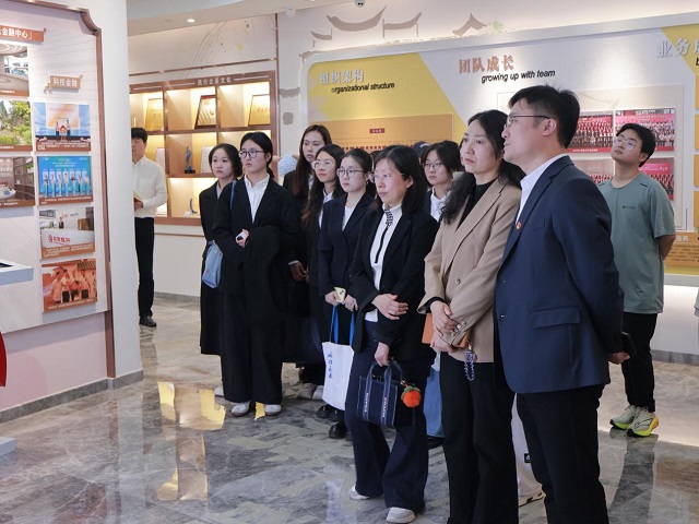 在讲解员引导下,同学们沉浸式了解了中心如何以专业化机制破解科创企业融资痛点,如何以全生命周期服务陪伴“专精特新”企业从种子成长为栋梁。从前沿技术研发的金融滴灌,到碳数据资产的评估定价;从科技企业的信贷模式创新,到数字技术驱动的智慧风控——那些曾在课堂上反复研讨的概念,在这里化为一项项真实运行的产品、一组组动态更新的数据、一个个鲜活成长的案例。同学们或凝神倾听,或踊跃发问,在清醒的认知中建立起“科技赋能绿色、金融滋养创新”的底层逻辑,真切感知到科技金融作为绿色发展助推器的磅礴力量。
